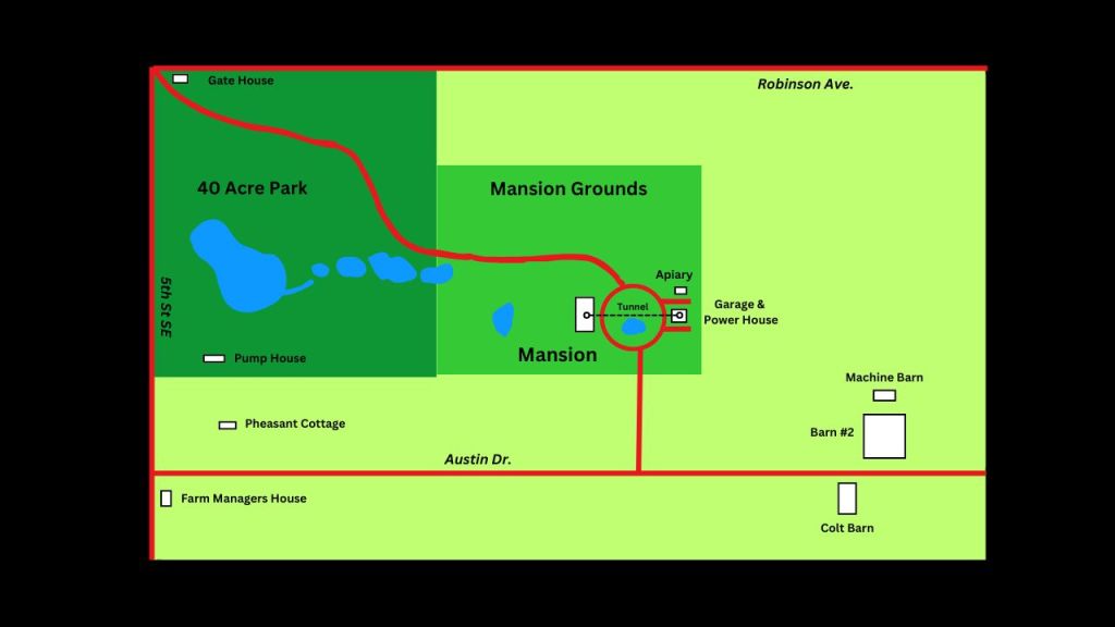 In 1909, Barber commissioned the construction of a three-story, 52-room mansion in Barberton, which took 18 months to complete. Designed in the French Renaissance Revival style by Akron architects Harpster & Bliss, the mansion spanned over 300 feet in length and covered 25,000 square feet. The construction cost exceeded $400,000 at the time (equivalent to $13.2 million today 2025). The mansion boasted luxurious amenities, including 16 bedrooms, an elevator with a glass skylight capable of holding 30 people, a solarium, extensive gardens, and a 40-acre park designed by a Chicago landscaping firm. A 200-foot tunnel connected the mansion’s basement to the carriage house . The mansion’s Great Hall measured 30 by 90 feet and featured a gold leaf ceiling. A mile-long driveway wound through the estate’s 50-acre front yard, leading to a scenic lake adorned with white and pink water lilies.